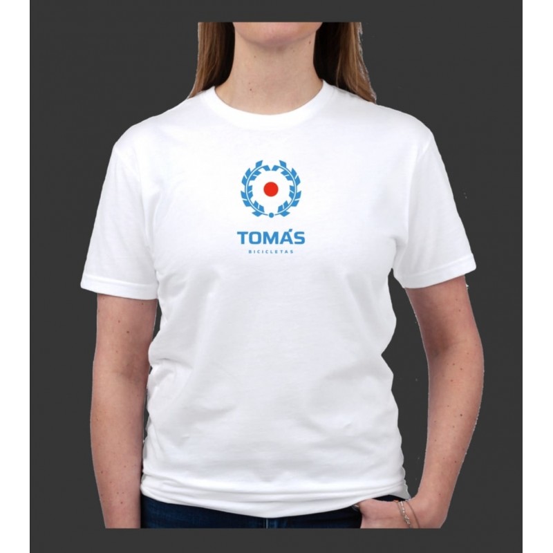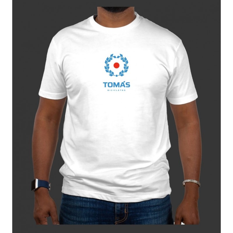 Camiseta de algodón 100€ con el logo moderno de Bicicletas Tomás.